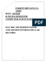 Expt 2) Assume a message of N characters length and display it in the rolling fashion .MODEL SMALL .DATA PORT EQU 378H ;PARALLEL PORT ADDRESS CONTROL EQU PORT+2 STATUS EQU PORT+1 LOOKUP DB 00,00,00,00,00,79h,39h,79h,5Eh,79h,73h, 78h,00,00,00,00,00 ; 00,00,00,00,00,73H,77H,77H,77H,38H,38H,79H,38H,73H,3FH,77H,7 8H,00,00,00,00,00 ;7SEGMENT CODE FOR "PARALLEL PORT" COUNT DW 11H QAX DW ? QDX DW ? .STACK 500H .CODE EXTRN PAWRITE :FAR EXTRN PBWRITE:FAR EXTRN CRWRITE:FAR START: MOV AX,@DATA MOV DS,AX MOV ES,AX MOV AL,80H ; CTRL WORD FOR 8255 CALL CRWRITE ;AGAIN: MOV CX,COUNT ; GIVES THE NUMBER OF CHARACTERS LEA SI,LOOKUP LOOP1: MOV DX,0FFFFH ; DELAY FOR A DISPLAY OF ONE ROLL ROLL: MOV BX,00H ; SETS COUNTER FOR NUBER OF 7SEG DISPLAY IN OUR CARD MOV QDX,DX MOV AL,11111110B ; SELECTION FOR A DISPLAY LOOP2: