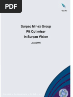 Overview An optimal pit for a deposit is one that maximises profit and satisfies both cost and slope constraints. Designing an optimal pit is a challenging and complex problem that is difficult to solve. As a result, several mathematical algorithms have been developed to solve this problem in a reasonable time frame. The Pit Optimiser developed by the Surpac Minex Group is based on a variation of the Lerchs Grossman algorithm that was first proposed by Koenigsberg in 1985. The Pit Optimiser works on a block model of the deposit where each block must have a net value that represents the economic value that will be returned if that block is extracted in isolation. The Pit Optimiser then considers each of these blocks in turn to work out which combinations of blocks should be mined in order to return the highest possible total value given mining constraints for a particular sale price. The result is a 3D surface that represents the base / limit of the pit that maximises the total value of the mine and any further extension of the pit will not increase the total return. Requirements Prior to performing the exercises in this chapter, you should: Be familiar with the basic principles of Surpac Vision. Be familiar with the Block model module and the Geological database module
