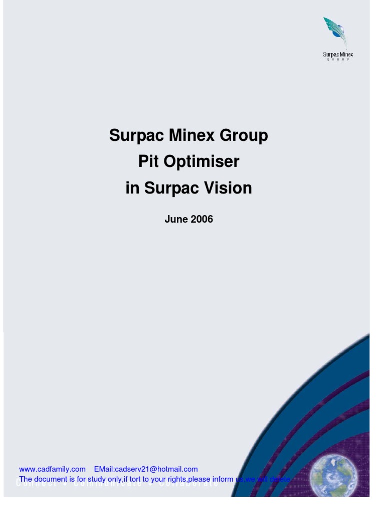 Copyright 2006 Surpac Minex Group Pty Ltd. All rights reserved. This software and documentation is proprietary to Surpac Minex Group Pty Ltd. Surpac Minex Group Pty Ltd publishes this documentation for the sole use of Surpac licenses. Without written permission you may not sell, reproduce, store in a retrieval system, or transmit any part of the documentation. For such permission, or to obtain extra copies please contact your local Surpac Minex Group Office. Surpac Minex Group Pty Ltd Level 8 190 St Georges Terrace Perth, Western Australia 6000 Telephone: (08) 94201383 Fax: (08) 94201350 While every precaution has been taken in the preparation of this manual, we assume no responsibility for errors or omissions. Neither is any liability assumed for damage resulting from the use of the information contained herein. All brand and product names are trademarks or registered trademarks of there respective companies. About This Manual This manual has been designed to provide a practical guide to the many uses of the software. The applications contained within this manual are by no means exhaustive as the possible uses of the software are only limited by the users imagination. However, it will give new users a starting point and existing users a good overview by demonstrating how to use may of the functions in Surpac Vision. If you have any difficulties or questions while working through this manual feel free to contact your local Surpac Minex Group Office. Author Rowdy Bristol Surpac Minex Group Perth, Western Australia Product Surpac Vision v5.1