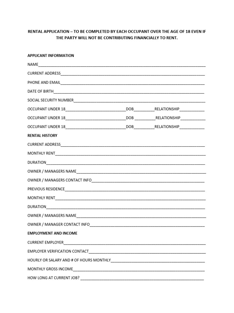 RENTAL APPLICATION – TO BE COMPLETED BY EACH OCCUPANT OVER THE AGE OF 18 EVEN IF