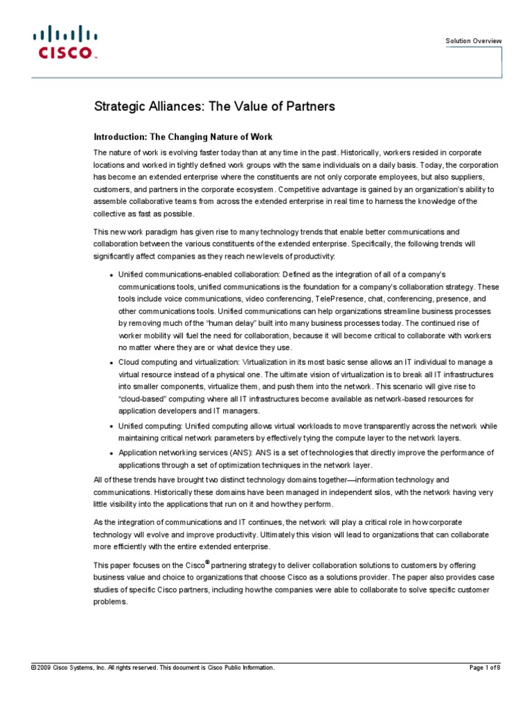 These statistics indicate that Cisco is at the epicenter of collaboration, creating a solid foundation on which Cisco can build a partnering strategy. The Need for Strategic Alliances and Other Partners The changing nature of work has accelerated the need to collaborate across departmental and corporate boundaries. This increased focus on network-based collaboration has required tight integration of the application stack with networks, communications, and mobility. As Cisco moves into the collaboration marketplace, it is developing deeper relationships with partners to offer customers complete solutions. According to Steve Steinhilber, Cisco Vice President of Strategic Alliances, a strategic alliance is a relationship between one or more organizations that through the combination of resources can create significant and sustainable value for everyone involved (Strategic Alliances: Three Ways to Make Them Work, Harvard Business Press, 2008). Cisco has developed a multifaceted partnering program (Figure 1) that can offer customers tangible business value. The global ecosystem of partners includes integration, channel, technology, and industry solution companies as well as service providers that provide a range of consulting, resale, outsourcing, services, and technology integration to offer customers a comprehensive collaboration strategy.