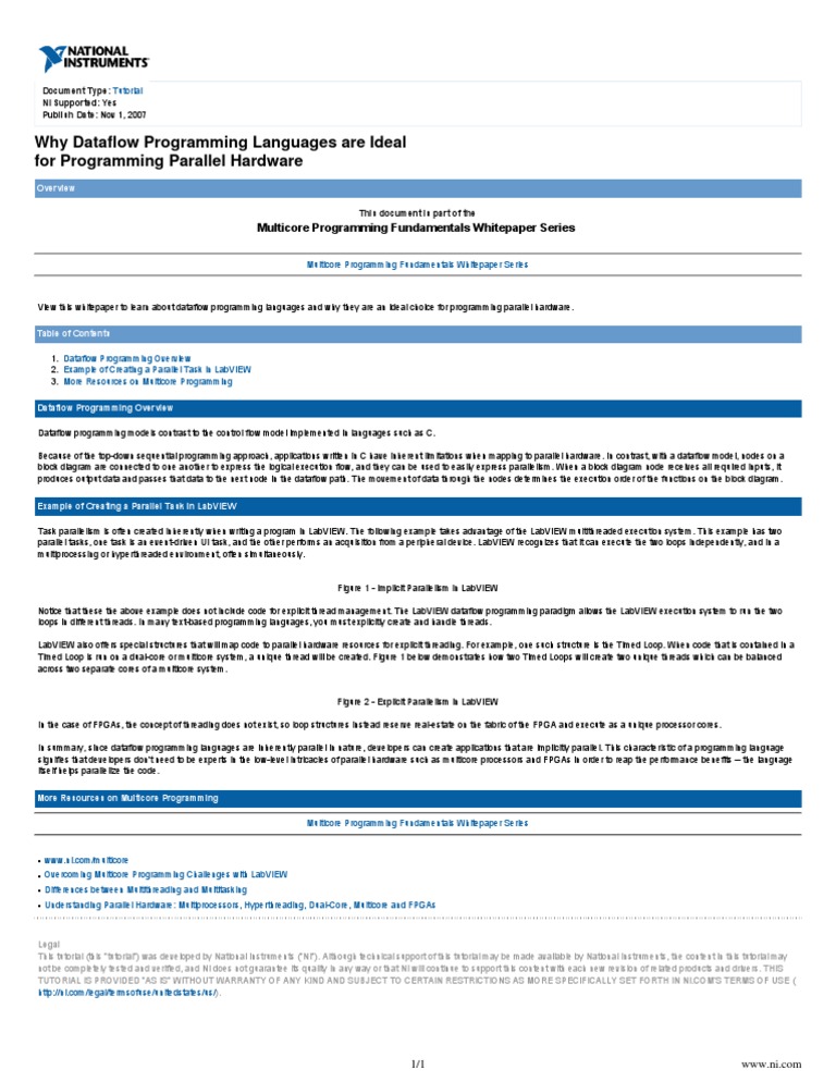 Viewthiswhitepapertolearnaboutdataflowprogramminglanguagesandwhytheyareanidealchoiceforprogrammingparallelhardware. Table of Contents 1.DataflowProgrammingOverview 2.ExampleofCreatingaParallelTaskinLabVIEW 3.MoreResourcesonMulticoreProgramming Dataflow Programming Overview DataflowprogrammingmodelscontrasttothecontrolflowmodelimplementedinlanguagessuchasC. Becauseofthetop-downsequentialprogrammingapproach,applicationswritteninChaveinherentlimitationswhenmappingtoparallelhardware.Incontrast,withadataflowmodel,nodesona blockdiagramareconnectedtooneanothertoexpressthelogicalexecutionflow,andtheycanbeusedtoeasilyexpressparallelism.Whenablockdiagramnodereceivesallrequiredinputs,it producesoutputdataandpassesthatdatatothenextnodeinthedataflowpath.Themovementofdatathroughthenodesdeterminestheexecutionorderofthefunctionsontheblockdiagram. Example of Creating a Parallel Task in LabVIEW TaskparallelismisoftencreatedinherentlywhenwritingaprograminLabVIEW.ThefollowingexampletakesadvantageoftheLabVIEWmultithreadedexecutionsystem.Thisexamplehastwo paralleltasks,onetaskisanevent-drivenUItask,andtheotherperformsanacquisitionfromaperipheraldevice.LabVIEWrecognizesthatitcanexecutethetwoloopsindependently,andina multiprocessingorhyperthreadedenvironment,oftensimultaneously.