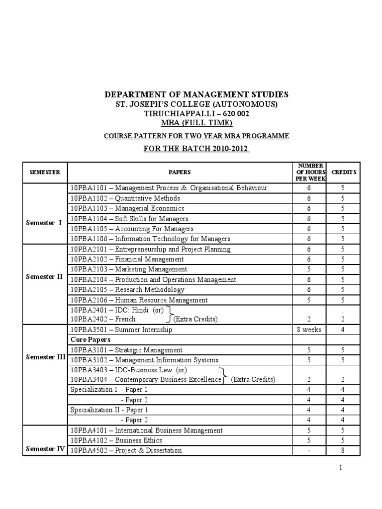 10PBA1101 Management Process & Organisational Behaviour 10PBA1102 Quantitative Methods 10PBA1103 Managerial Economics 10PBA1104 Soft Skills for Managers Semester I 10PBA1105 Accounting For Managers 10PBA1106 Information Technology for Managers 10PBA2101 Entrepreneurship and Project Planning 10PBA2102 Financial Management 10PBA2103 Marketing Management Semester II 10PBA2104 Production and Operations Management 10PBA2105 Research Methodology 10PBA2106 Human Resource Management 10PBA2401 IDC: Hindi (or) 10PBA2402 French (Extra Credits) 10PBA3501 Summer Internship Core Papers 10PBA3101 Strategic Management Semester III 10PBA3102 Management Information Systems 10PBA3403 IDC-Business Law (or) 10PBA3404 Contemporary Business Excellence (Extra Credits) Specialization I - Paper 1 - Paper 2 Specialization II - Paper 1 - Paper 2 10PBA4101 International Business Management 10PBA4102 Business Ethics Semester IV 10PBA4502 Project & Dissertation