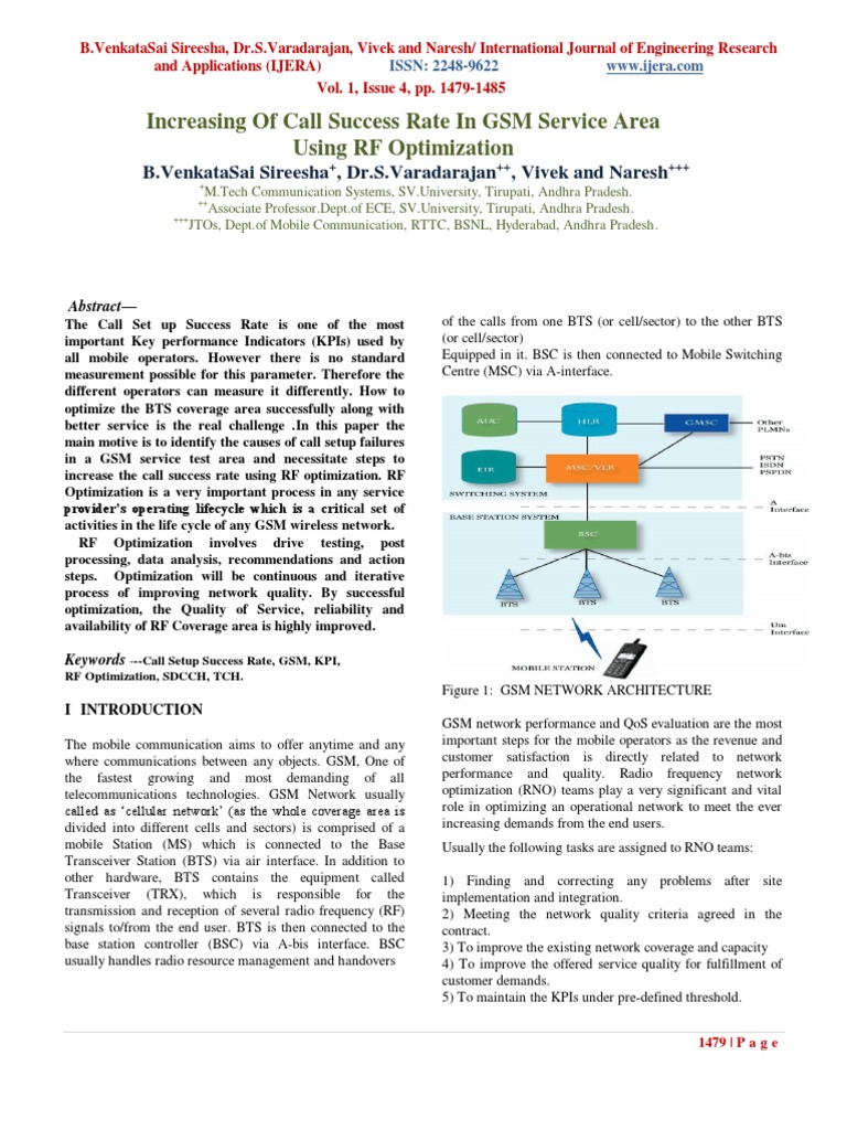 The mobile communication aims to offer anytime and any where communications between any objects. GSM, One of the fastest growing and most demanding of all telecommunications technologies. GSM Network usually called as cellular network (as the whole coverage area is divided into different cells and sectors) is comprised of a mobile Station (MS) which is connected to the Base Transceiver Station (BTS) via air interface. In addition to other hardware, BTS contains the equipment called Transceiver (TRX), which is responsible for the transmission and reception of several radio frequency (RF) signals to/from the end user. BTS is then connected to the base station controller (BSC) via A-bis interface. BSC usually handles radio resource management and handovers GSM network performance and QoS evaluation are the most important steps for the mobile operators as the revenue and customer satisfaction is directly related to network performance and quality. Radio frequency network optimization (RNO) teams play a very significant and vital role in optimizing an operational network to meet the ever increasing demands from the end users. Usually the following tasks are assigned to RNO teams: 1) Finding and correcting any problems after site implementation and integration. 2) Meeting the network quality criteria agreed in the contract. 3) To improve the existing network coverage and capacity 4) To improve the offered service quality for fulfillment of customer demands. 5) To maintain the KPIs under pre-defined threshold. 1479 | P a g e