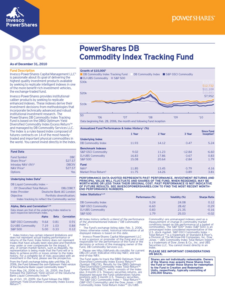 As of December 31, 2010 Fund Description Invesco PowerShares Capital Management LLC3 is passionate about its goal of delivering the highest quality investment products available by seeking to replicate intelligent indexes in one of the more benet-rich investment vehicles, the exchange-traded fund. Invesco PowerShares provides institutionalcaliber products by seeking to replicate enhanced indexes. These indexes derive their investment decisions from methodologies that incorporate technically advanced and robust institutional investment research. The PowerShares DB Commodity Index Tracking Fund is based on the DBIQ Optimum Yield Diversied Commodity Index Excess Return and managed by DB Commodity Services LLC. The Index is a rules-based index composed of futures contracts on 14 of the most heavilytraded and important physical commodities in the world. You cannot invest directly in the Index.