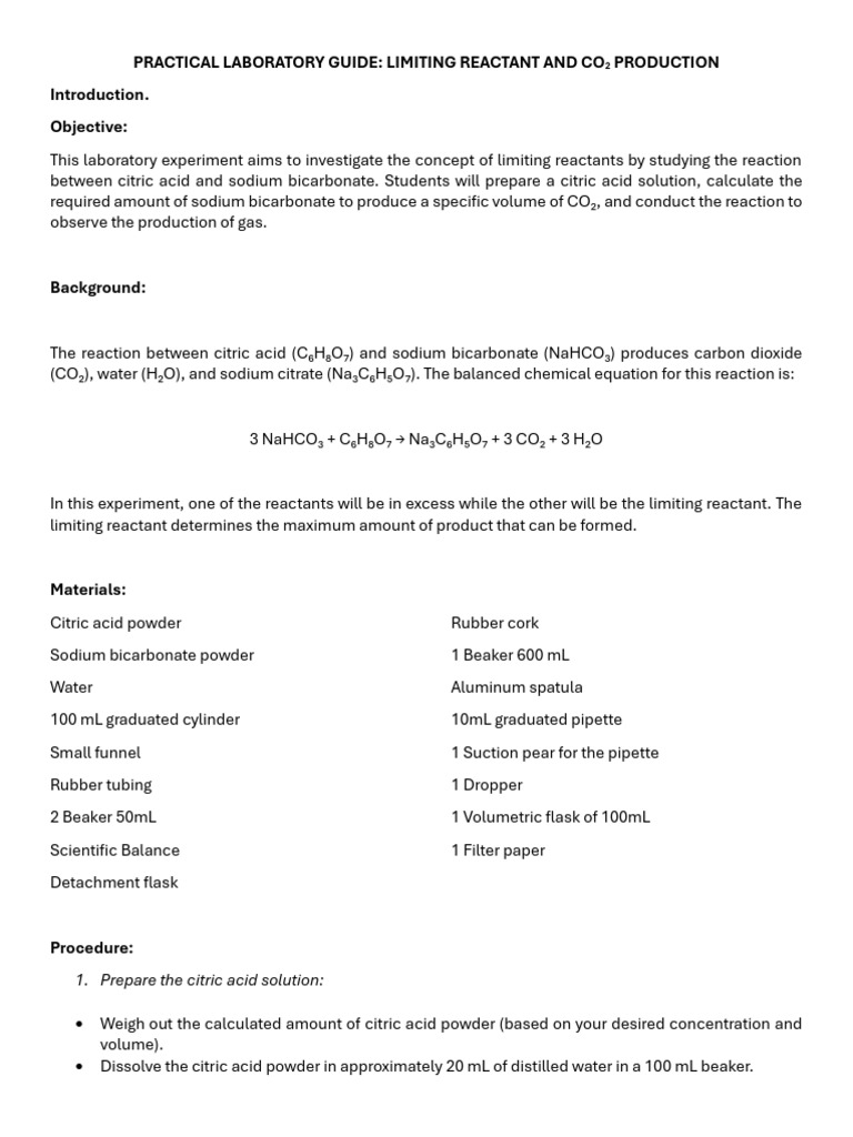 PRACTICAL LABORATORY GUIDE: LIMITING REACTANT AND CO2 PRODUCTION