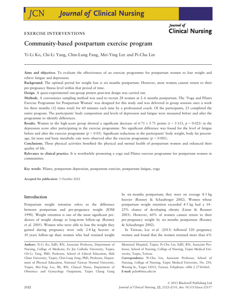 Methods. A convenience sampling method was used to recruit 28 women at 2–6 months postpartum. The ‘Yoga and Pilates