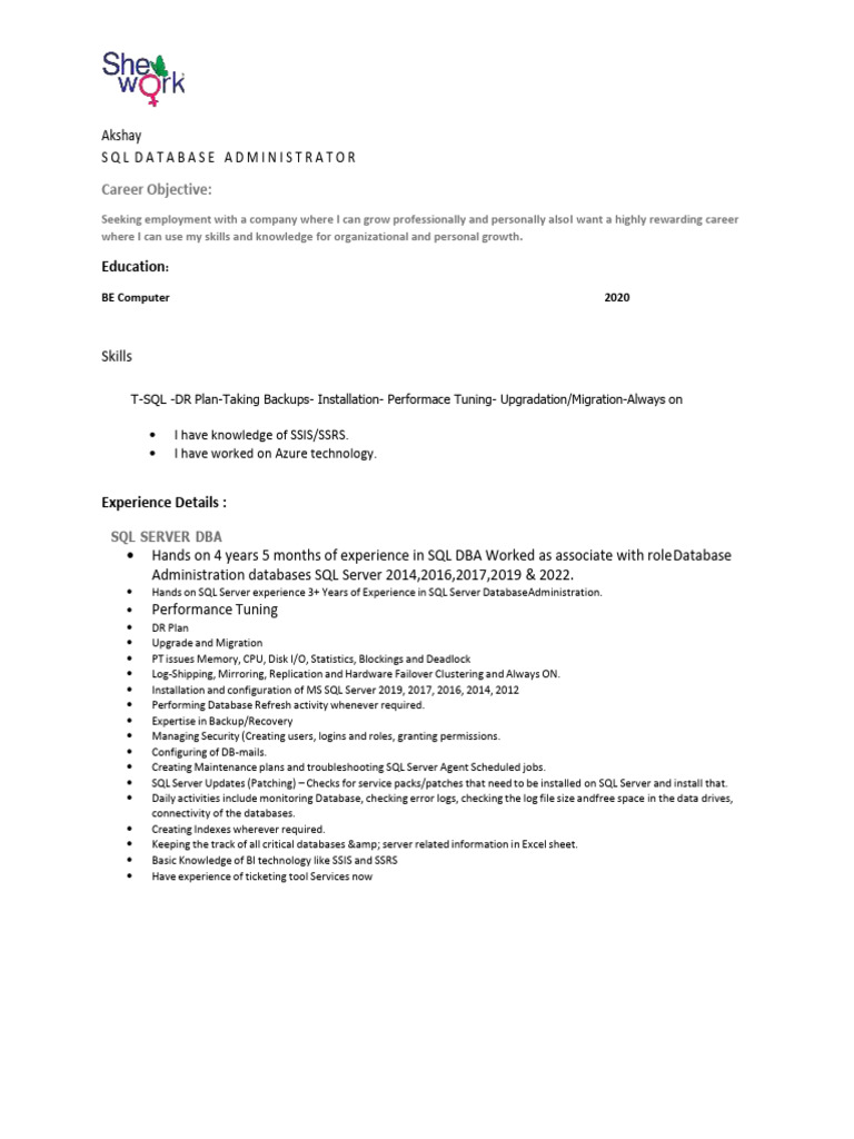 • Hands on 4 years 5 months of experience in SQL DBA Worked as associate with role Database
