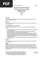 length is determined by measuring the distance between the inlet and the outlet; and the depth must not be less than 3 ft nor greater than 5 ft for safety reasons and for maximum efficiency. OR Option 3: Sediment basin(s) shall be designed using the standard equation: As=1.2Q/Vs Where: As = Minimum surface area for trapping soil particles of a certain size Vs = Settling velocity of the design particle size chosen Q=CIA Where Q = Discharge rate measured in cubic feet per second C = Runoff coefficient I = Precipitation intensity for the 10-year, 6-hour rain event A = Area draining into the sediment basin in acres The design particle size shall be the smallest soil grain size determined by wet sieve analysis, or the fine silt sized (0.01 mm [or 0.0004 in.]) particle, and the Vs used shall be 100 percent of the calculated settling velocity. The length is determined by measuring the distance between the inlet and the outlet; the length shall be more than twice the dimension as the width; the depth shall not be less than 3 ft nor greater than 5 ft for safety reasons and for maximum efficiency (2 ft of sediment storage, 2 ft of capacity). The basin(s) shall be located on the site where it can be maintained on a year-round basis and shall be maintained on a schedule to retain the 2 ft of capacity. OR Option 4: The use of an equivalent surface area design or equation, provided that the design efficiency is as protective or more protective of water quality than Option 3. (Eq. 1)