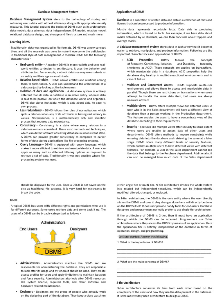measures. This tutorial explains the basics of DBMS such as its architecture,