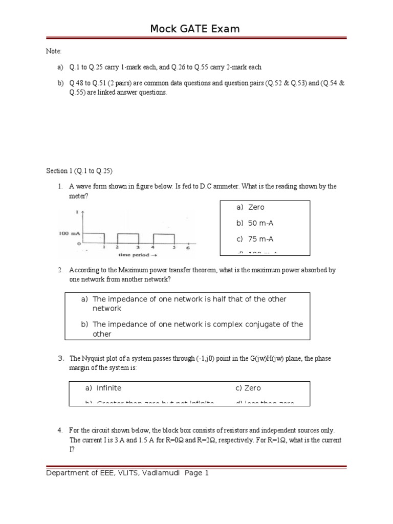 Section 1 (Q.1 to Q.25) 1. A wave form shown in figure below. Is fed to D.C ammeter. What is the reading shown by the meter? a) Zero b) 50 m-A c) 75 m-A d) 100 m-A 2. According to the Maximum power transfer theorem, what is the maximum power absorbed by one network from another network? a) The impedance of one network is half that of the other network b) The impedance of one network is complex conjugate of the other 3. The Nyquist plot of a system passes through (-1,j0) point in the G(jw)H(jw) plane, the phase margin of the system is: a) Infinite b) Greater than zero but not infinite c) Zero d) less than zero