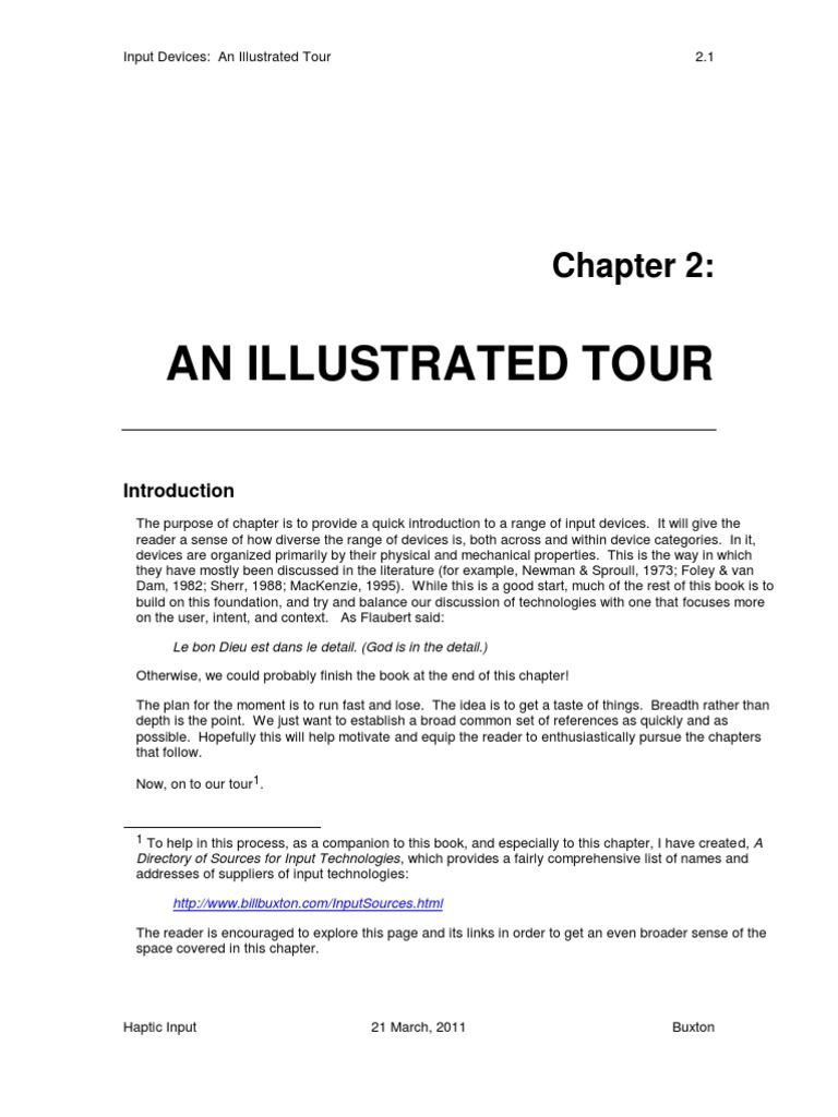 The purpose of chapter is to provide a quick introduction to a range of input devices. It will give the reader a sense of how diverse the range of devices is, both across and within device categories. In it, devices are organized primarily by their physical and mechanical properties. This is the way in which they have mostly been discussed in the literature (for example, Newman & Sproull, 1973; Foley & van Dam, 1982; Sherr, 1988; MacKenzie, 1995). While this is a good start, much of the rest of this book is to build on this foundation, and try and balance our discussion of technologies with one that focuses more on the user, intent, and context. As Flaubert said: Le bon Dieu est dans le detail. (God is in the detail.) Otherwise, we could probably finish the book at the end of this chapter! The plan for the moment is to run fast and lose. The idea is to get a taste of things. Breadth rather than depth is the point. We just want to establish a broad common set of references as quickly and as possible. Hopefully this will help motivate and equip the reader to enthusiastically pursue the chapters that follow. Now, on to our tour1.