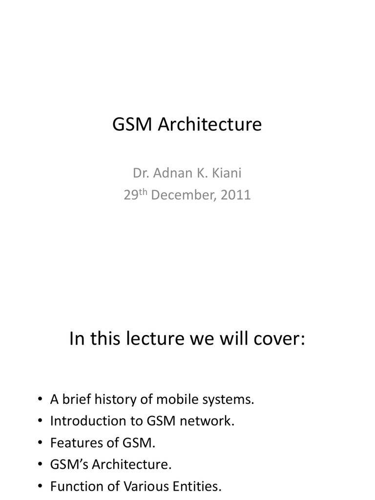 A brief history of mobile systems. Introduction to GSM network. Features of GSM. GSMs Architecture. Function of Various Entities.