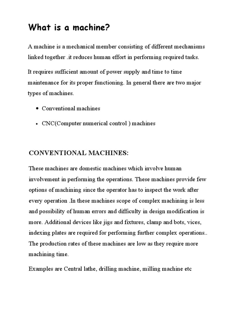 A machine is a mechanical member consisting of different mechanisms linked together .it reduces human effort in performing required tasks. It requires sufficient amount of power supply and time to time maintenance for its proper functioning. In general there are two major types of machines. Conventional machines