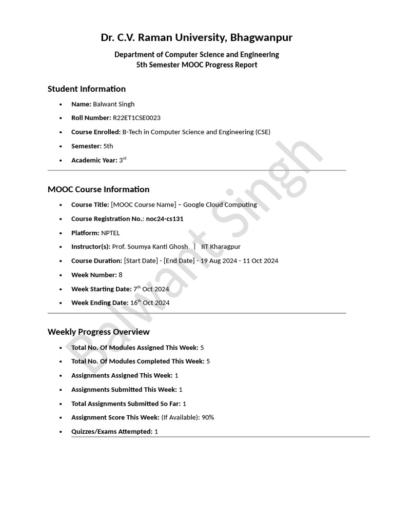 This detailed MOOC Progress Report provides a comprehensive overview of the student's weekly