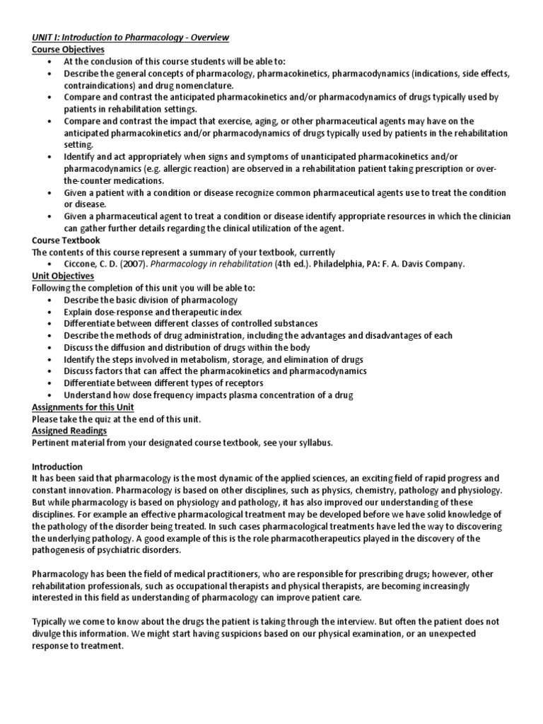 be the general concepts of pharmacology, pharmacokinetics, pharmacodynamics (indications, side effects, contraindications) and drug nomenclature. Compare and contrast the anticipated pharmacokinetics and/or pharmacodynamics of drugs typically used by patients in rehabilitation settings. Compare and contrast the impact that exercise, aging, or other pharmaceutical agents may have on the anticipated pharmacokinetics and/or pharmacodynamics of drugs typically used by patients in the rehabilitation setting. Identify and act appropriately when signs and symptoms of unanticipated pharmacokinetics and/or pharmacodynamics (e.g. allergic reaction) are observed in a rehabilitation patient taking prescription or overthe-counter medications. Given a patient with a condition or disease recognize common pharmaceutical agents use to treat the condition or disease. Given a pharmaceutical agent to treat a condition or disease identify appropriate resources in which the clinician can gather further details regarding the clinical utilization of the agent. Course Textbook The contents of this course represent a summary of your textbook, currently Ciccone, C. D. (2007). Pharmacology in rehabilitation (4th ed.). Philadelphia, PA: F. A. Davis Company. Unit Objectives Following the completion of this unit you will be able to: Describe the basic division of pharmacology Explain dose-response and therapeutic index Differentiate between different classes of controlled substances Describe the methods of drug administration, including the advantages and disadvantages of each Discuss the diffusion and distribution of drugs within the body Identify the steps involved in metabolism, storage, and elimination of drugs Discuss factors that can affect the pharmacokinetics and pharmacodynamics Differentiate between different types of receptors Understand how dose frequency impacts plasma concentration of a drug Assignments for this Unit Please take the quiz at the end of this unit. Assigned Readings Pertinent material from your designated course textbook, see your syllabus. Introduction It has been said that pharmacology is the most dynamic of the applied sciences, an exciting field of rapid progress and constant innovation. Pharmacology is based on other disciplines, such as physics, chemistry, pathology and physiology. But while pharmacology is based on physiology and pathology, it has also improved our understanding of these disciplines. For example an effective pharmacological treatment may be developed before we have solid knowledge of the pathology of the disorder being treated. In such cases pharmacological treatments have led the way to discovering the underlying pathology. A good example of this is the role pharmacotherapeutics played in the discovery of the pathogenesis of psychiatric disorders. Pharmacology has been the field of medical practitioners, who are responsible for prescribing drugs; however, other rehabilitation professionals, such as occupational therapists and physical therapists, are becoming increasingly interested in this field as understanding of pharmacology can improve patient care. Typically we come to know about the drugs the patient is taking through the interview. But often the patient does not divulge this information. We might start having suspicions based on our physical examination, or an unexpected response to treatment.