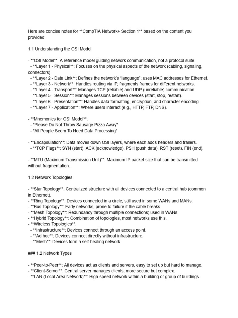 Here are concise notes for **CompTIA Network+ Section 1** based on the content you