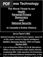 The Communications Industry, because of its usefulness to Government, Finance, Intelligence gathering and Warfare, is really in the position where it is spiralling out of any persons ability to control it, with regard to advancing technology. Initially, all systems pulsed. However, when it was realised that stealth microwave warfare relies on entrainment of a brain from such pulses (now being used as a domestic instrument) the pulses had to be renamed as modulations. The difference between them is infinitesimally small, but the effect is just the same. Only the name has changed. I believe that this explains the dramatic changes in behaviour we are now witnessing - group suicides, disruption in schools, aggression and so on. Over the years, I have compiled a list of known entrainment responses (followed by long-term potentiation) from these microwaves. It should be appreciated that each person will respond slightly differently, although the same area of brain/temporal/ amygdaloid temporal/parotid/etc., will remain the same. ** It is worth mentioning that a mobile phone with a pulse/modulation frequency of 25 could act directly on visual sight (if being held at head), or heartbeat (if in a chest pocket). A frequency of 25 can disrupt both visual and heart neurotransmitters. Clearly a susceptible person may have any combination of these. Electrosensitive persons may recognise many of their own symptoms. My work on electrosensitivity and the brain can be found on www.mastsanity.org . I think the problem is that young Governments and young communications engineers have no knowledge of Cold War warfare and dont know who to ask; even if they did, the Government would probably be in denial. The situation is a mess, made worse by greed. If anyone would like clarification of any of the foregoing, or I can help in any way, please let me know. Barrie Trower 3 Flowers Meadow Liverton, Devon TQ12 6UP 01626 821014