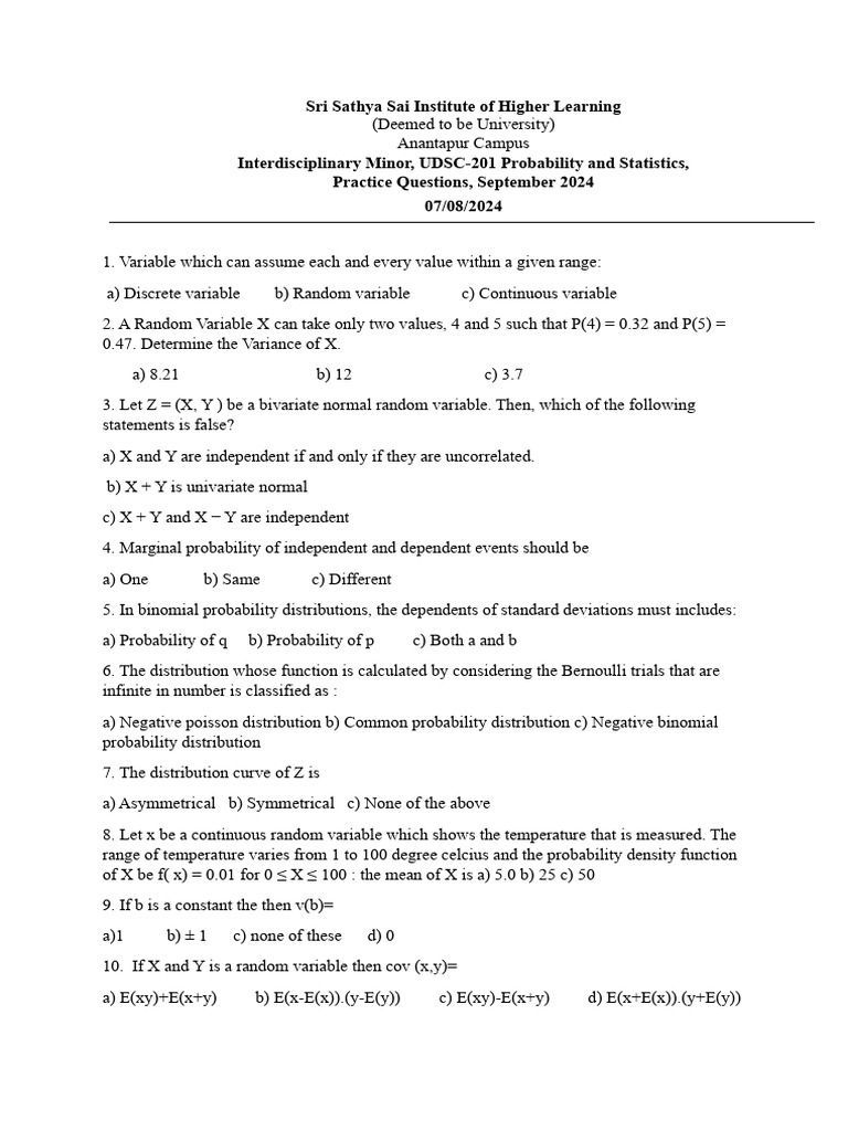 Interdisciplinary Minor, UDSC-201 Probability and Statistics,