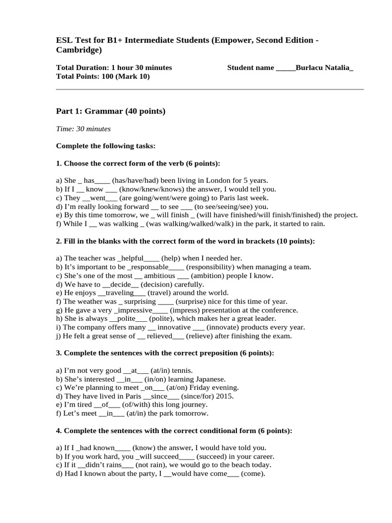 ESL Test for B1+ Intermediate Students (Empower, Second Edition -