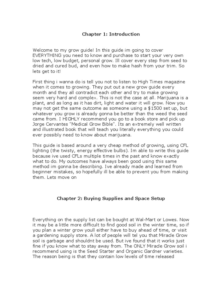 In this guide im going to cover EVERYTHING you need to know and purchase to start your very own low tech, low budget, personal grow. Ill cover every step from seed to dried and cured bud, and even how to make hash from your trim. So lets get to it! First thing i wanna do is tell you not to listen to High Times magazine when it comes to growing. They put out a new grow guide every month and they all contradict each other and try to make growing seem very hard and complex. This is not the case at all. Marijuana is a plant, and as long as it has dirt, light and water it will grow. Now you may not get the same outcome as someone using a $1500 set up, but whatever you grow is already gonna be better than the weed the seed came from. I HIGHLY recommend you go to a book store and pick up Jorge Cervantes "Medical Grow Bible". Its an extremely well written and illustrated book that will teach you literally everything you could ever possibly need to know about marijuana. This guide is based around a very cheap method of growing, using CFL lighting (the twisty, energy effective bulbs). Im able to write this guide because ive used CFLs multiple times in the past and know exactly what to do. My outcomes have always been good using this same method im gonna be describing. Ive already made and learned from beginner mistakes, so hopefully ill be able to prevent you from making them. Lets move on