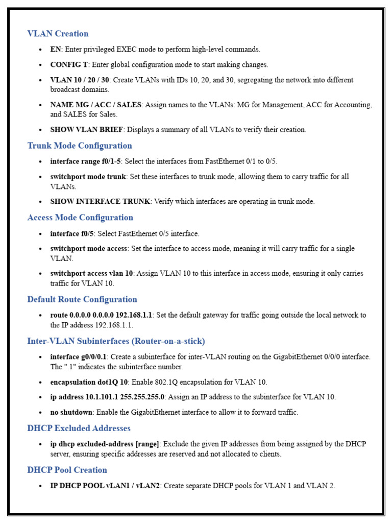 • IP DHCP POOL vLAN1 / vLAN2: Create separate DHCP pools for VLAN 1 and VLAN 2.
