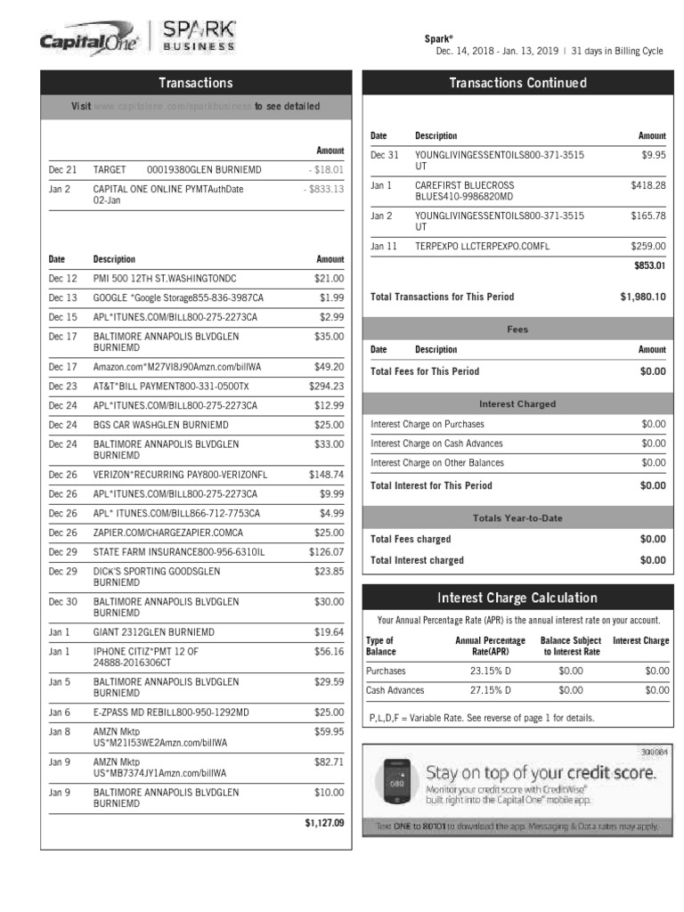 Jan 16 CAPITAL ONE ONLINE PYMTAuthDate - $1,160.43 Feb 11 BALTIMORE ANNAPOLIS BLVDGLEN $30.00
