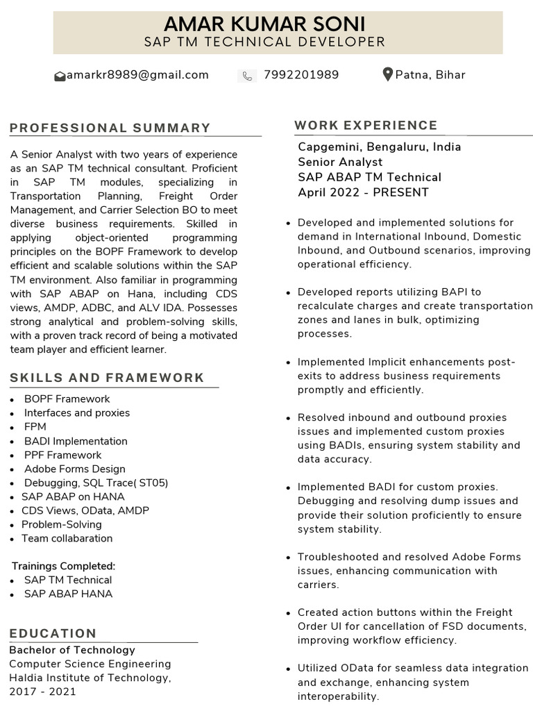 in SAP TM modules, specializing in SAP ABAP TM Technical