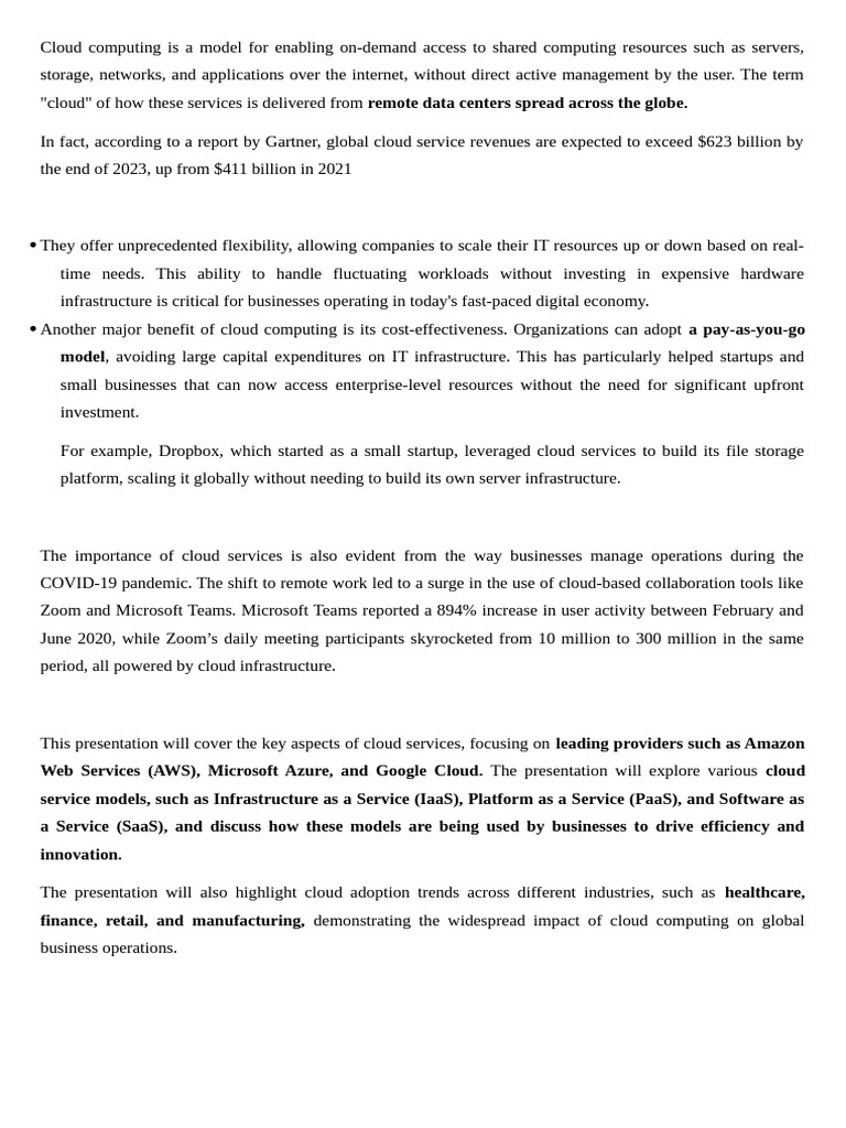 Web Services (AWS), Microsoft Azure, and Google Cloud. The presentation will explore various cloud