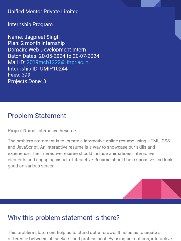 The problem statement is to create a interactive online resume using HTML, CSS