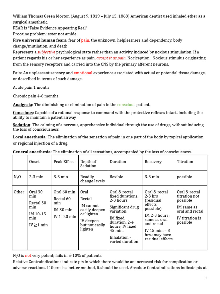 relaxed and comfortable), analgesia (diminution or elimination of pain in the conscious patient).