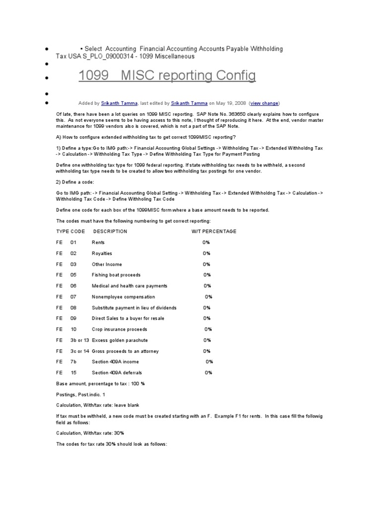 Added by Srikanth Tamma, last edited by Srikanth Tamma on May 19, 2008 (view change) Of late, there have been a lot queries on 1099 MISC reporting. SAP Note No. 363650 clearly explains how to configure this. As not everyone seems to be having access to this note, I thought of reproducing it here. At the end, vendor master maintenance for 1099 vendors also is covered, which is not a part of the SAP Note. A) How to configure extended withholding tax to get correct 1099MISC reporting? 1) Define a type:Go to IMG path:-> Financial Accounting Global Settings -> Withholding Tax -> Extended Withholdng Tax -> Calculation -> Withholding Tax Type -> Define Withholding Tax Type for Payment Posting Define one withholding tax type for 1099 federal reporting. If state withholding tax needs to be withheld, a second withholding tax type needs to be created to allow two withholding tax postings for one vendor. 2) Define a code: Go to IMG path: -> Financial Accounting Global Setting -> Withholding Tax -> Extended Withholdng Tax -> Calculation -> Withholding Tax Code -> Define Withholing Tax Code Define one code for each box of the 1099MISC form where a base amount needs to be reported. The codes must have the following numbering to get correct reporting: TYPE CODE FE FE FE FE FE FE FE FE FE FE FE FE FE 01 02 03 05 06 07 08 09 10 DESCRIPTION Rents Royalties Other Income Fishing boat proceeds Medical and health care payments Nonemployee compensation Substitute payment in lieu of dividends Direct Sales to a buyer for resale Crop insurance proceeds W/T PERCENTAGE 0% 0% 0% 0% 0% 0% 0% 0% 0% 0% 0% 0% 0%