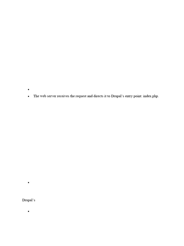 • The web server receives the request and directs it to Drupal’s entry point: index.php.