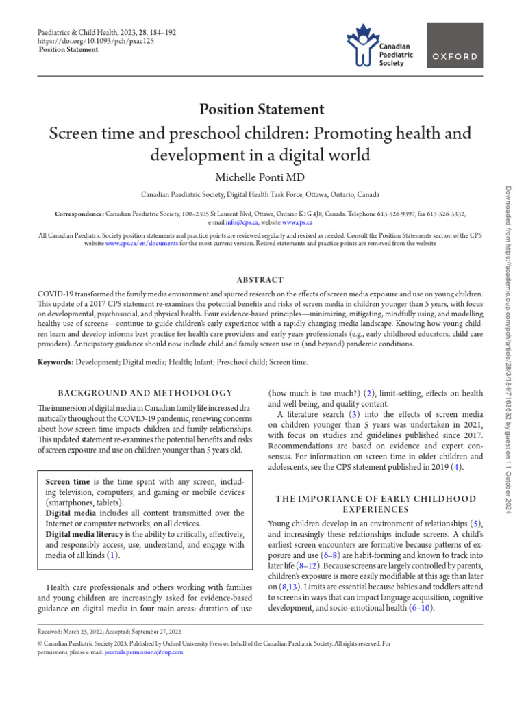This update of a 2017 CPS statement re-examines the potential benefits and risks of screen media in children younger than 5 years, with focus