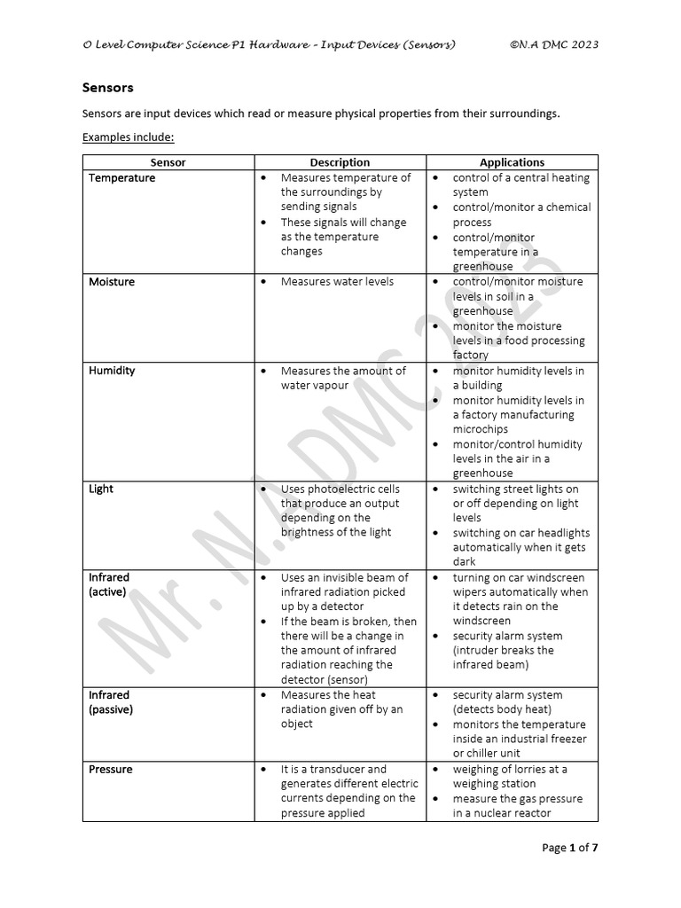 O Level Computer Science P1 Hardware – Input Devices (Sensors) ©N.A DMC 2023