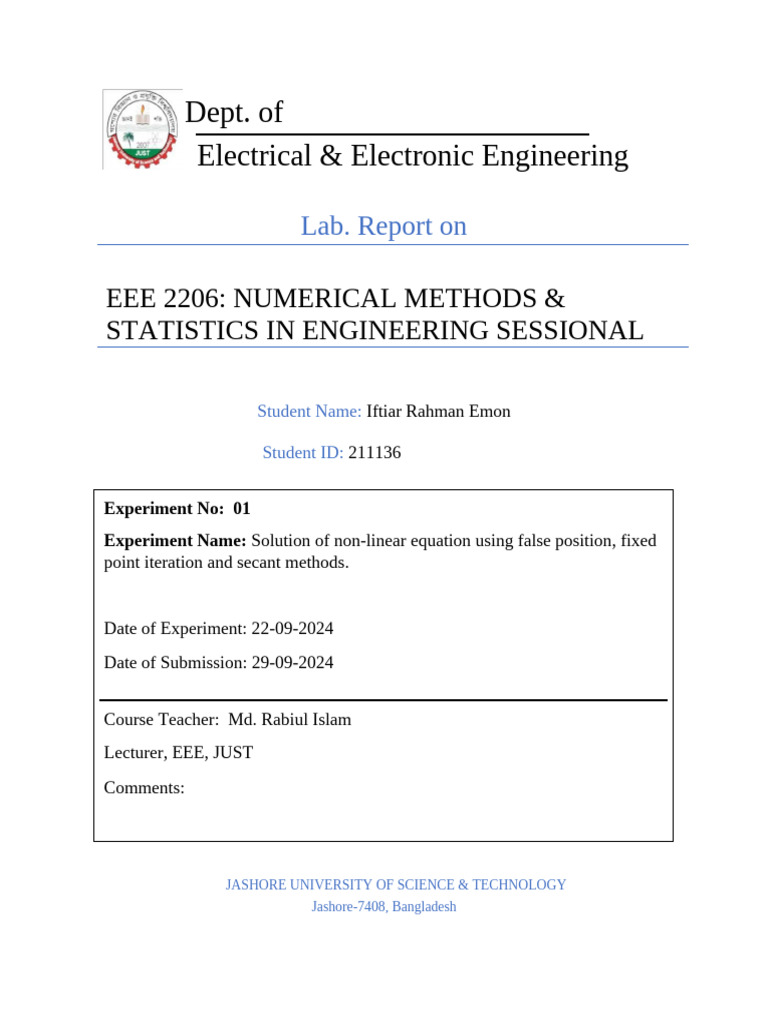 Experiment Name: Solution of non-linear equation using false position, fixed point iteration