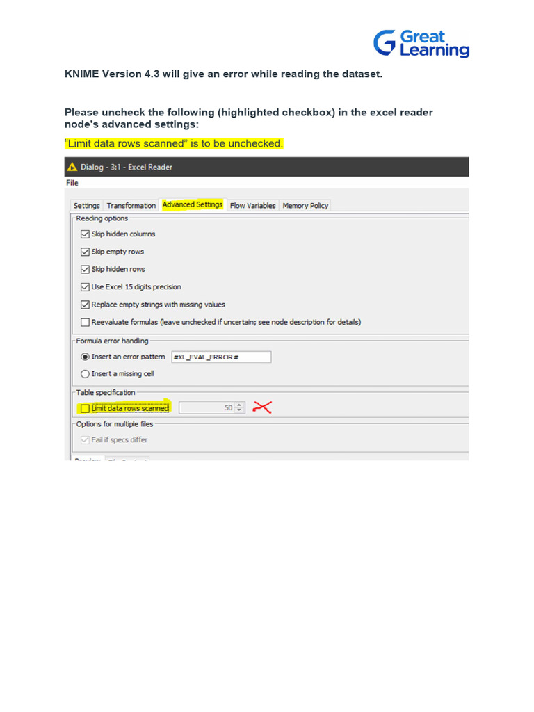Please uncheck the following (highlighted checkbox) in the excel reader