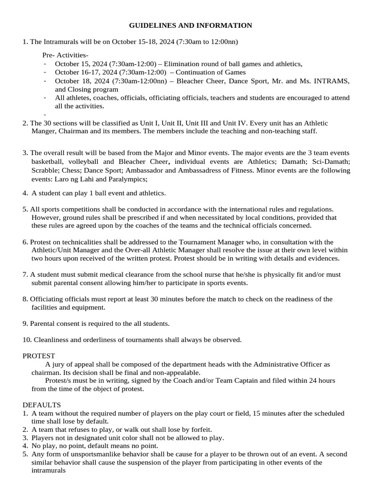 1. The Intramurals will be on October 15-18, 2024 (7:30am to 12:00nn)