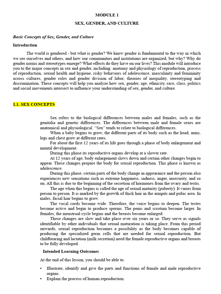 you to the major concepts in sex and gender, including: anatomy and physiology of reproduction, process