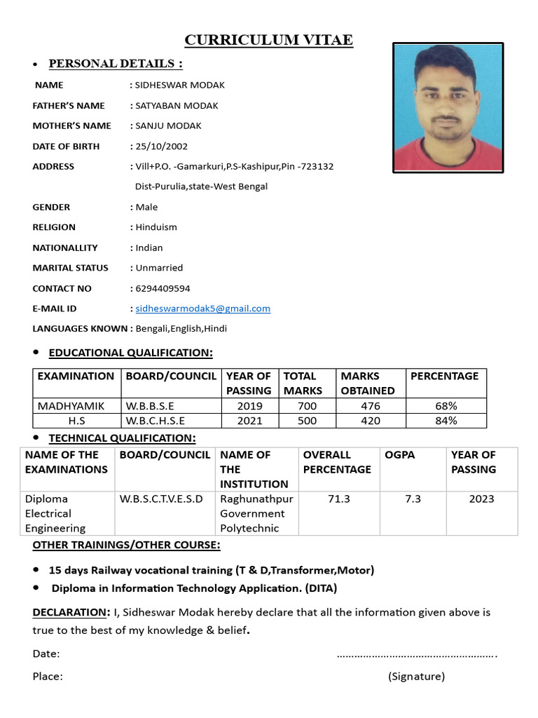 DECLARATION: I, Sidheswar Modak hereby declare that all the information given above is