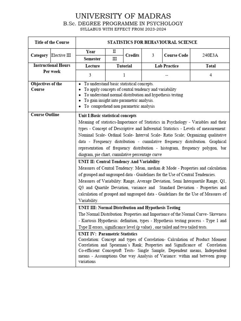 Title of the Course STATISTICS FOR BEHAVIOURAL SCIENCE