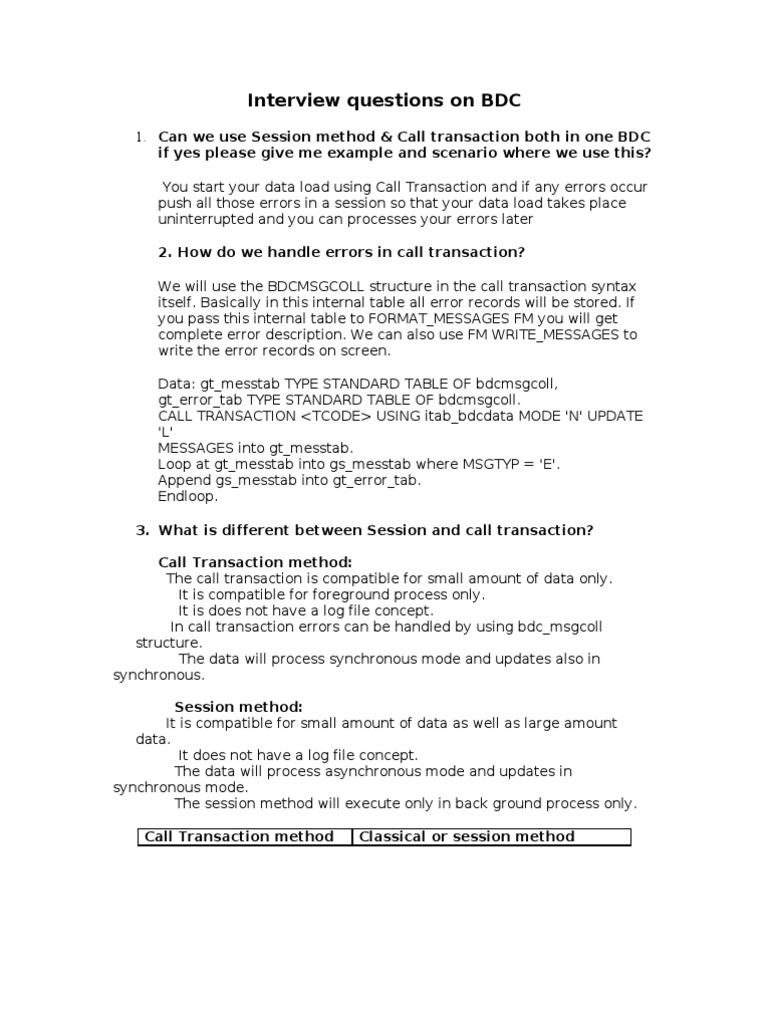 The call transaction mode can take the following values: 'A' Display screen 'E' Display only if an error occurs 'N' do not display 'P' do not display; debugging possible If the MODE addition is omitted, then the processing mode is 'A'. If a screen is displayed in processing mode 'E' because the system reached the end of the BDC data, the system automatically switches to processing mode 'A'. If breakpoints are set in a transaction tcode called using the CALL TRANSACTION tcode USING itab variant, these are not actually reached in 'N' mode. The system tries to insert data in the Debugger screen; the call ends with SY-SUBRC = 1001 and the message "Batch input data is not available for screen SAPMSSY3 0131" (S 00 344). Conversely, in 'P' mode, transaction screens are processed in the background (as in 'N' mode) and debugging is possible. 5. Tell me fields in BDCDATA. 6. Tell me fields in BDCMSGCOLL. 7. How do you handle table maintenance in BDC? 8. Tell FM names, which you use in Session Method? 9. Tell mandatory parameters in FM BDC_OPEN_GROUP and BDC_INSERT? 10. What is the use of KEEP Parameter in FM BDC_OPEN_GROUP? 11. What is the use of HOLDDATE in FM BDC_OPEN_GROUP? 12. Can u upload 2 transactions data using Session Method? 13. Why BAPI perform better performance than BDC? 14. What is difference between BAPI and BDC in data uploading? 15. Tell some few advantages of BAPI rather than BDC? 16. In session and call transaction methods, which is faster method and why? 17. What is the difference between synchronous and asynchronous?