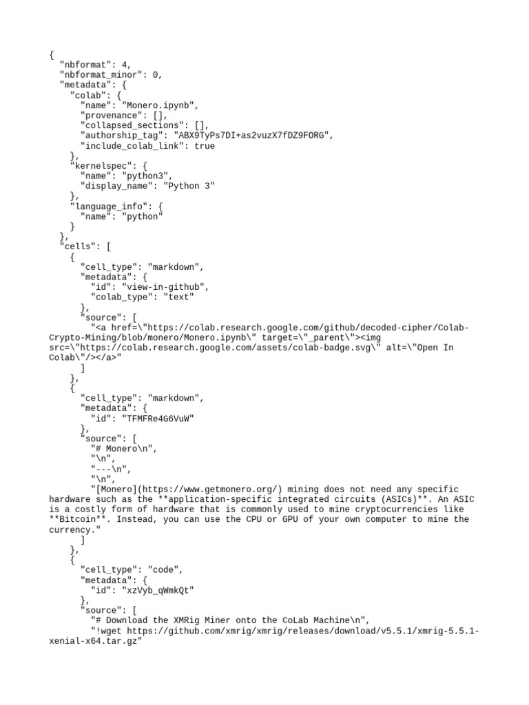 "nbformat": 4, "nbformat_minor": 0, "metadata": { "colab": { "name": "Monero.ipynb", "provenance": [], "collapsed_sections": [], "authorship_tag": "ABX9TyPs7DI+as2vuzX7fDZ9FORG", "include_colab_link": true }, "kernelspec": { "name": "python3", "display_name": "Python 3" }, "language_info": { "name": "python" } }, "cells": [ { "cell_type": "markdown", "metadata": { "id": "view-in-github", "colab_type": "text" }, "source": [ "<a href=\"https://colab.research.google.com/github/decoded-cipher/Colab-Crypto-Mining/blob/monero/Monero.ipynb\" target=\"_parent\"><imgsrc=\"https://colab.research.google.com/assets/colab-badge.svg\" alt=\"Open InColab\"/></a>" ] }, { "cell_type": "markdown", "metadata": { "id": "TFMFRe4G6VuW" }, "source": [ "# Monero\n", "\n", "---\n", "\n", "[Monero](https://www.getmonero.org/) mining does not need any specifichardware such as the **application-specific integrated circuits (ASICs)**. An ASICis a costly form of hardware that is commonly used to mine cryptocurrencies like**Bitcoin**. Instead, you can use the CPU or GPU of your own computer to mine thecurrency." ] }, { "cell_type": "code", "metadata": { "id": "xzVyb_qWmkQt" }, "source": [ "# Download the XMRig Miner onto the CoLab Machine\n", "!wget https://github.com/xmrig/xmrig/releases/download/v5.5.1/xmrig-5.5.1-xenial-x64.tar.gz" ], "execution_count": null, "outputs": [] }, { "cell_type": "code", "metadata": { "id": "WsD5OpPSmx5C" }, "source": [ "#Extract the Archive Files\n", "!tar -zxf xmrig-5.5.1-xenial-x64.tar.gz" ], "execution_count": null, "outputs": [] }, { "cell_type": "code", "metadata": { "id": "wZc3KkBim0Uu" }, "source": [ "# Move into the folder\n", "cd xmrig-5.5.1" ], "execution_count": null, "outputs": [] }, { "cell_type": "markdown", "metadata": { "id": "j8SZuQJd-SUN" }, "source": [ "* Here we use the **Cryptonight Algorithm** to Mine Monero **(Proof-of-Work)**.\n", "* I choose for [MinerGate Mining Pool](https://minergate.com/).\n", "* Replace ***rtsnzmc8ak4mbcx*** with your MinerGate User ID." ] }, { "cell_type": "code", "metadata": { "id": "lwnzM_eWm2Rp" }, "source": [ "# Run the XMRig Miner\n", "!./xmrig -a cryptonight -o stratum+tcp://xmr.pool.minergate.com:45700 -urtsnzmc8ak4mbcx -p x" ], "execution_count": null, "outputs": [] } ]}