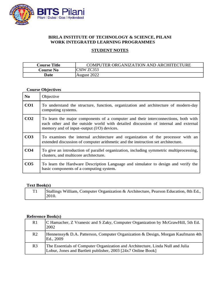 CO1 To understand the structure, function, organization and architecture of modern-day