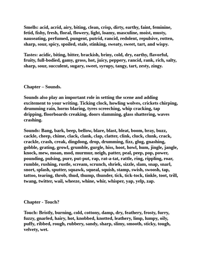 Touch: Bristly, burning, cold, cottony, damp, dry, feathery, frosty, furry,