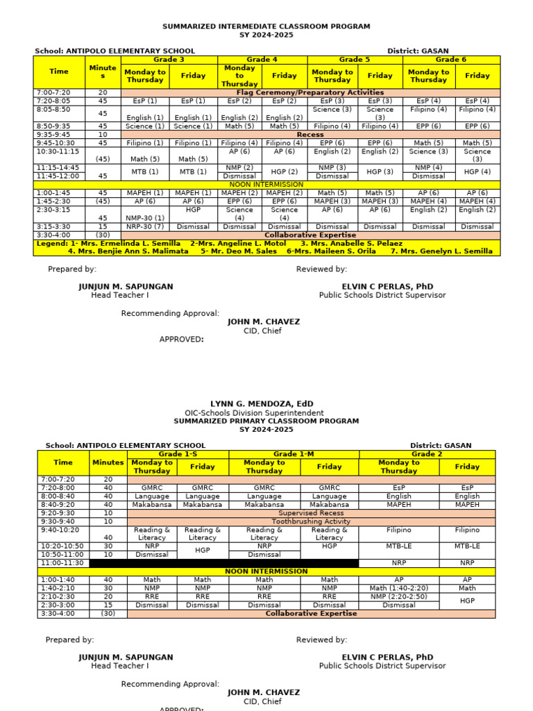 1:00-1:45 45 MAPEH (1) MAPEH (1) MAPEH (2) MAPEH (2) Math (5) Math (5) AP (6) AP (6)