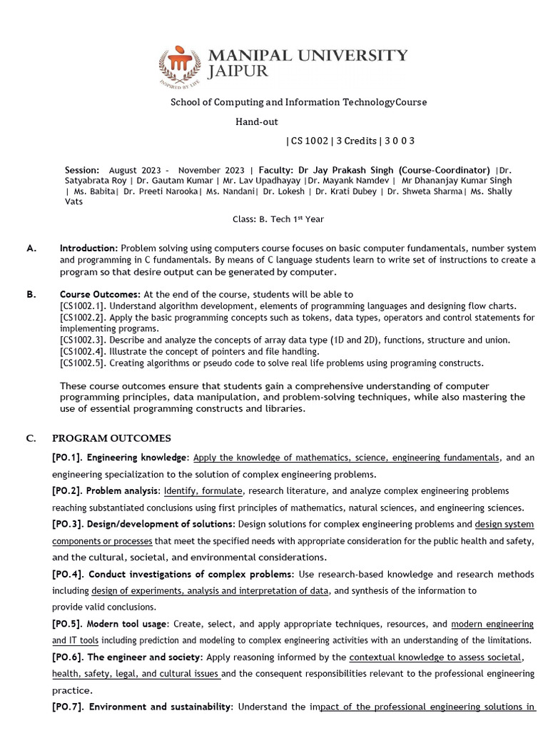 Problem Solving Using Computers| CS 1002 | 3 Credits | 3 0 0 3