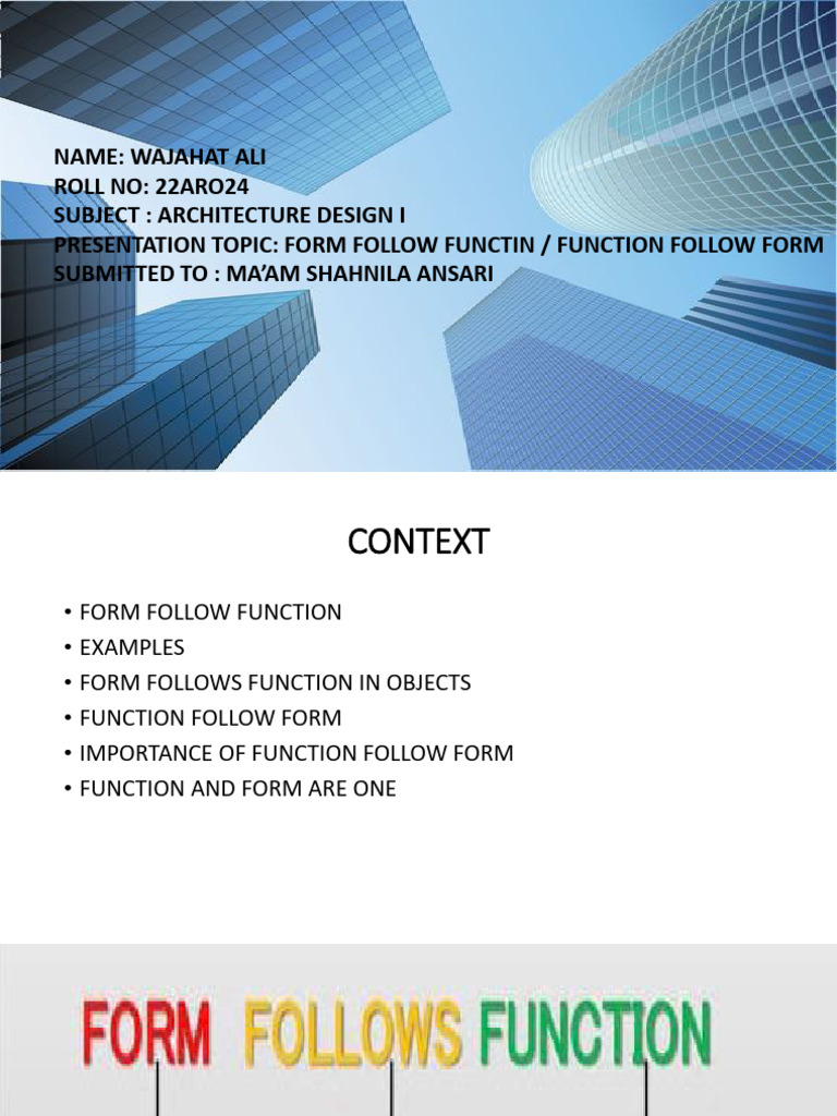 PRESENTATION TOPIC: FORM FOLLOW FUNCTIN / FUNCTION FOLLOW FORM