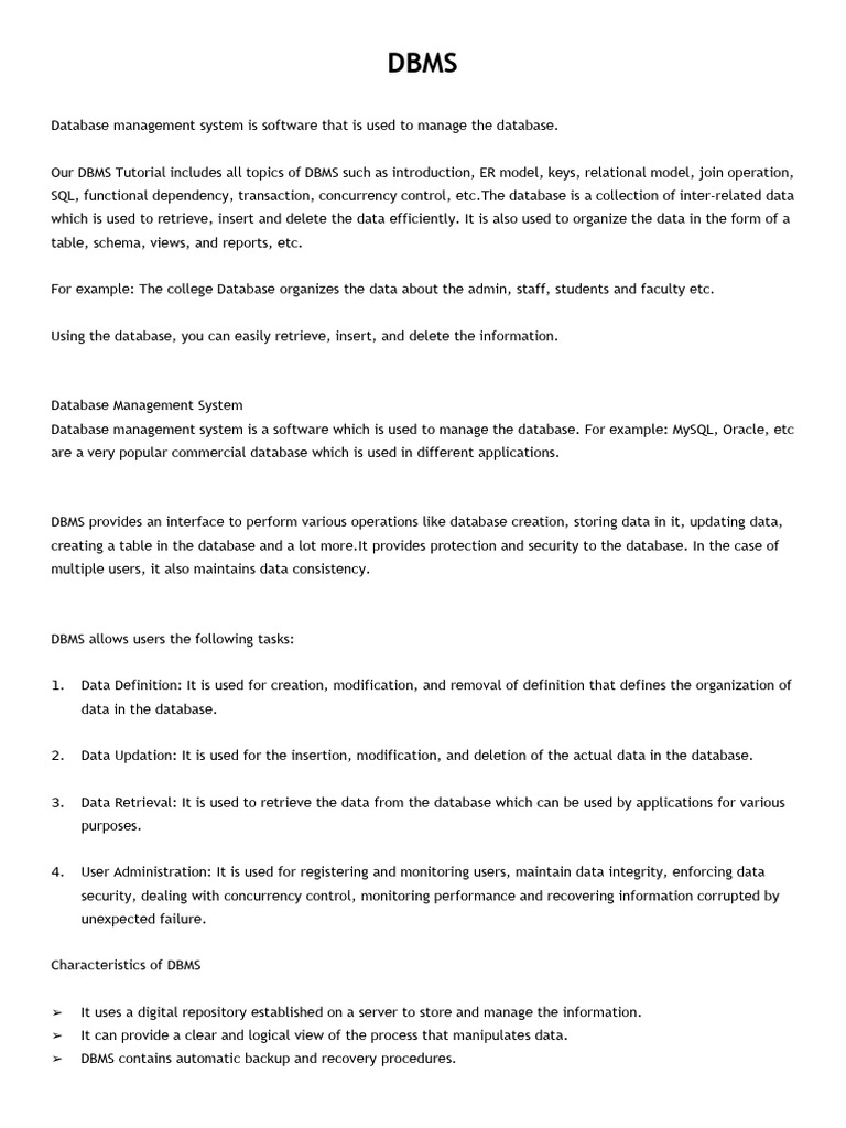 Our DBMS Tutorial includes all topics of DBMS such as introduction, ER model, keys, relational model, join operation,