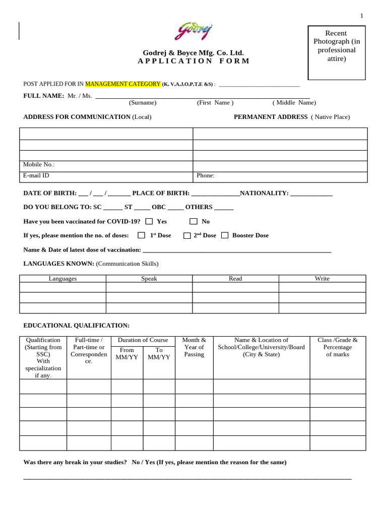 REFERENCES: (Name of the relatives / acquaintances in any of the Godrej establishments)
